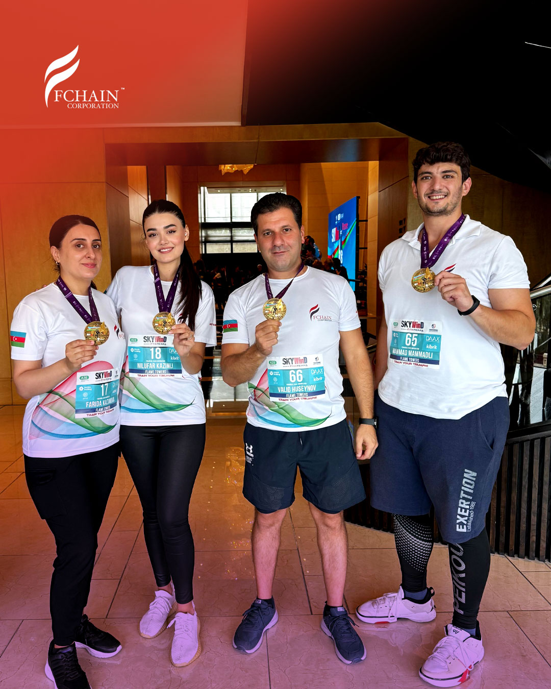 The race required participants to run up to the 32nd final floor of the Flame Towers, covering a vertical height of 160 meters. Alongside local and international professional athletes in the PRO category from Spain, Slovakia, Romania and Croatia, the FCHAIN team also took part in this exciting competition, completed the distance and earned a participant medal.