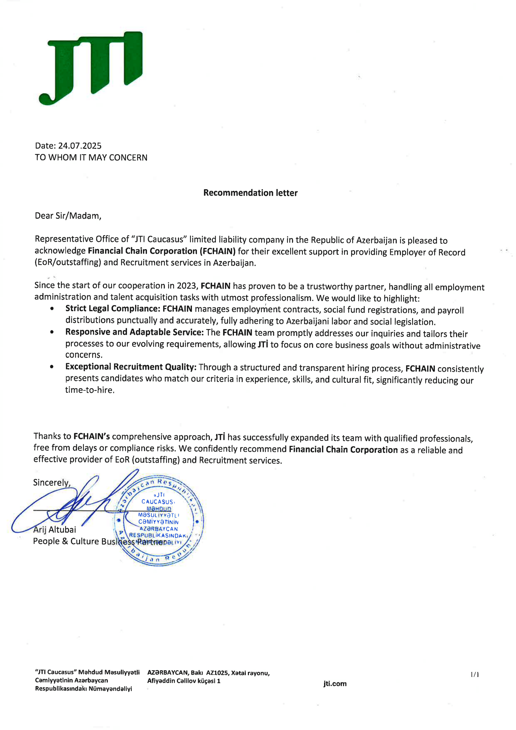 JTİ is pleased to acknowledge Financial Chain Corporation (FCHAIN) for their excellent support in providing Employer of Record (EoR/outstaffing) and Recruitment services in Azerbaijan.